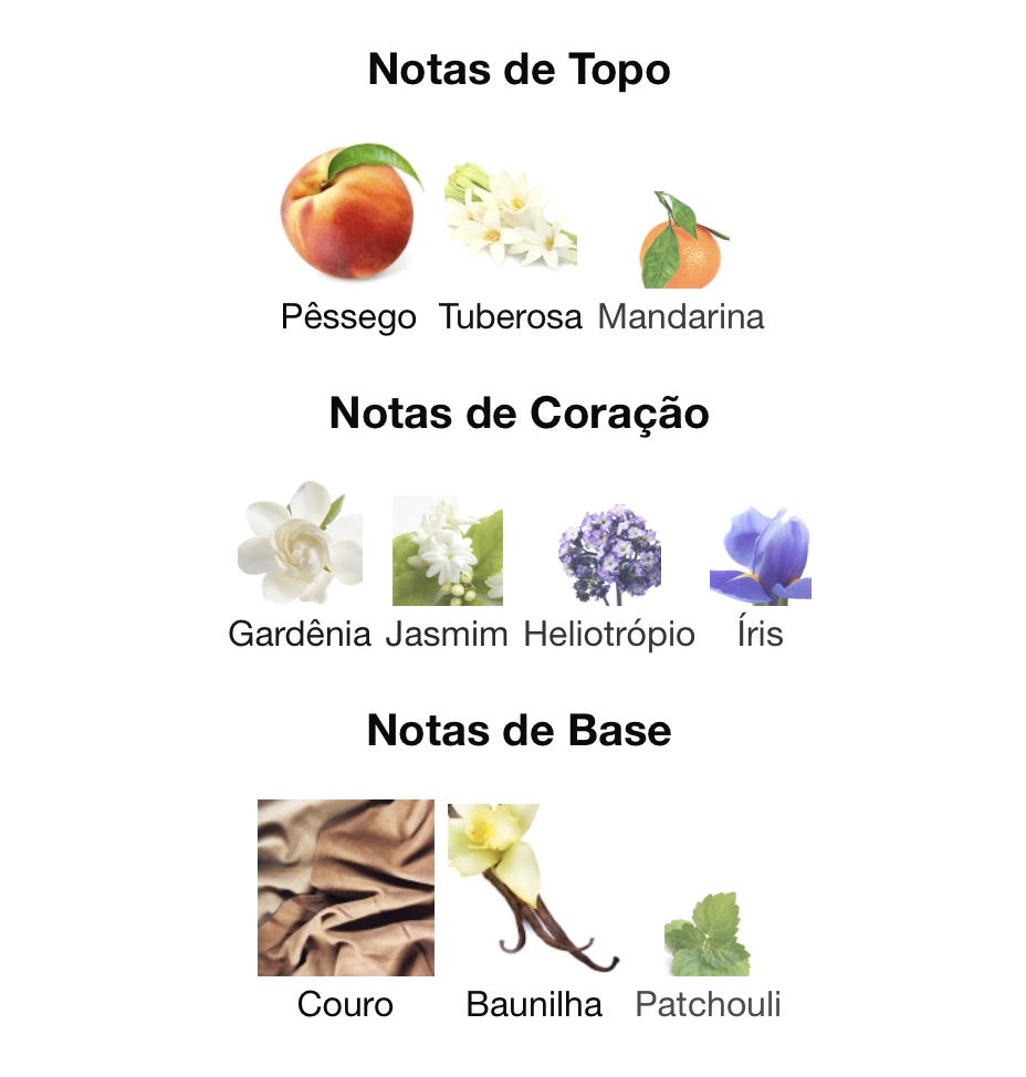 Pêssego, Tuberosa e Mandarina – saída cremosa e vibrante, frutada com um toque floral envolvente.